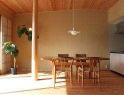片流れ屋根の平屋住宅。島根県産の無垢材をLDKに使用しています。