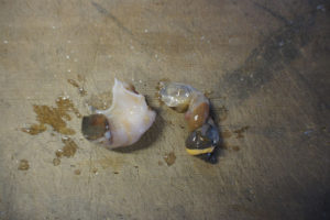 (1)バイ貝の殻を、出刃包丁のみねや金づちといった、硬いものでたたき割ります。