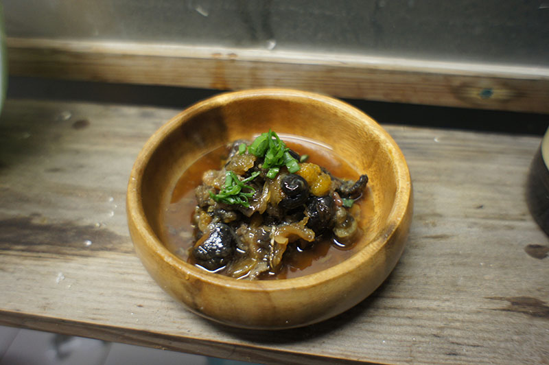 - (8)切り分けた肝の部分は、醤油・みりん・砂糖とショウガで煮た甘辛煮がオススメです。