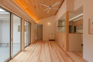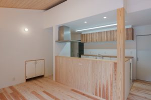 ▼リビング・ダイニング・キッチン 島根県産の無垢材を、床・天上・キッチンカウンターに使用。