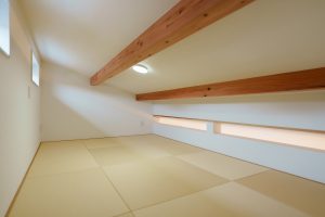 ▼ロフト 片流れ屋根の構造を上手く利用したロフトは、休憩スペースと物置に。