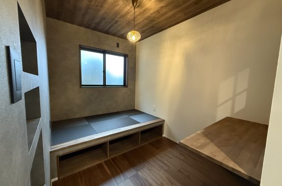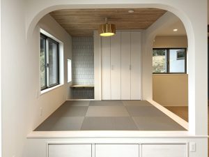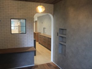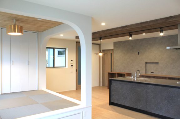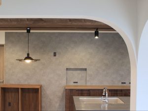 リビングの小上がりとキッチン横の趣味部屋には角丸のアーチ壁を採用。